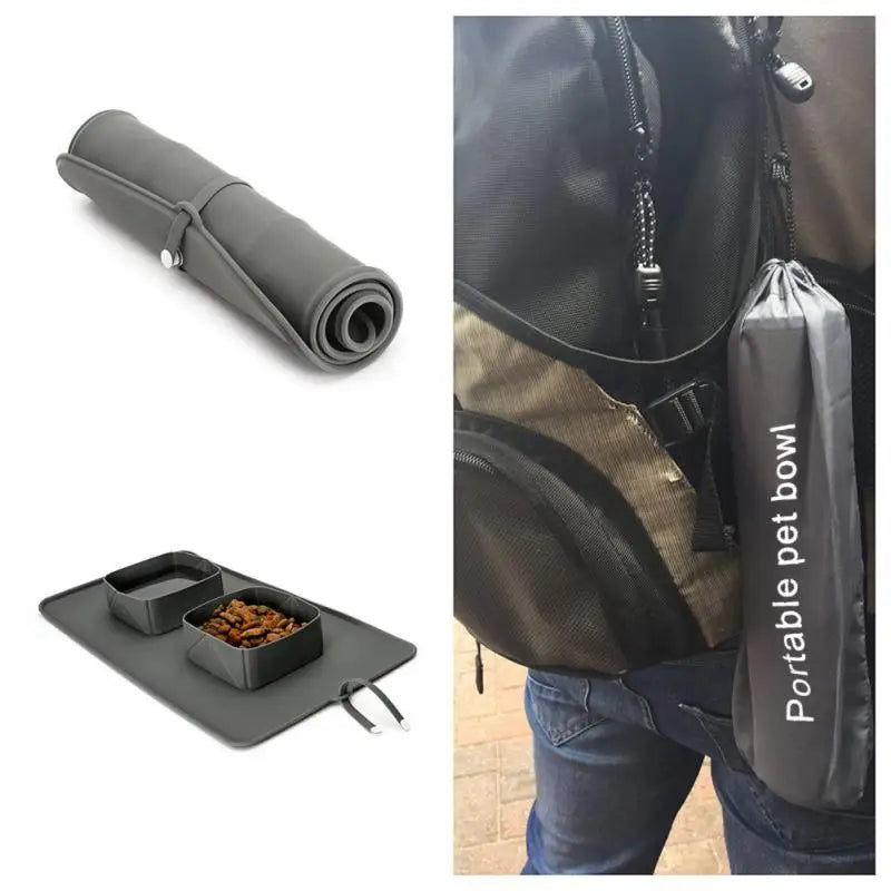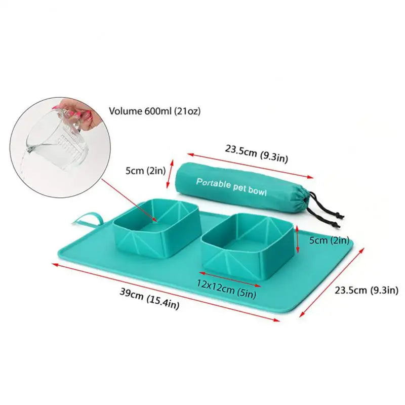 Pet Bowl 600ml Cat Dog Pet Bowl Folding Silicone Double Bowl Flannel Bag Dog Bowl Outdoor Puppy Food Container Portable Pet Bowl